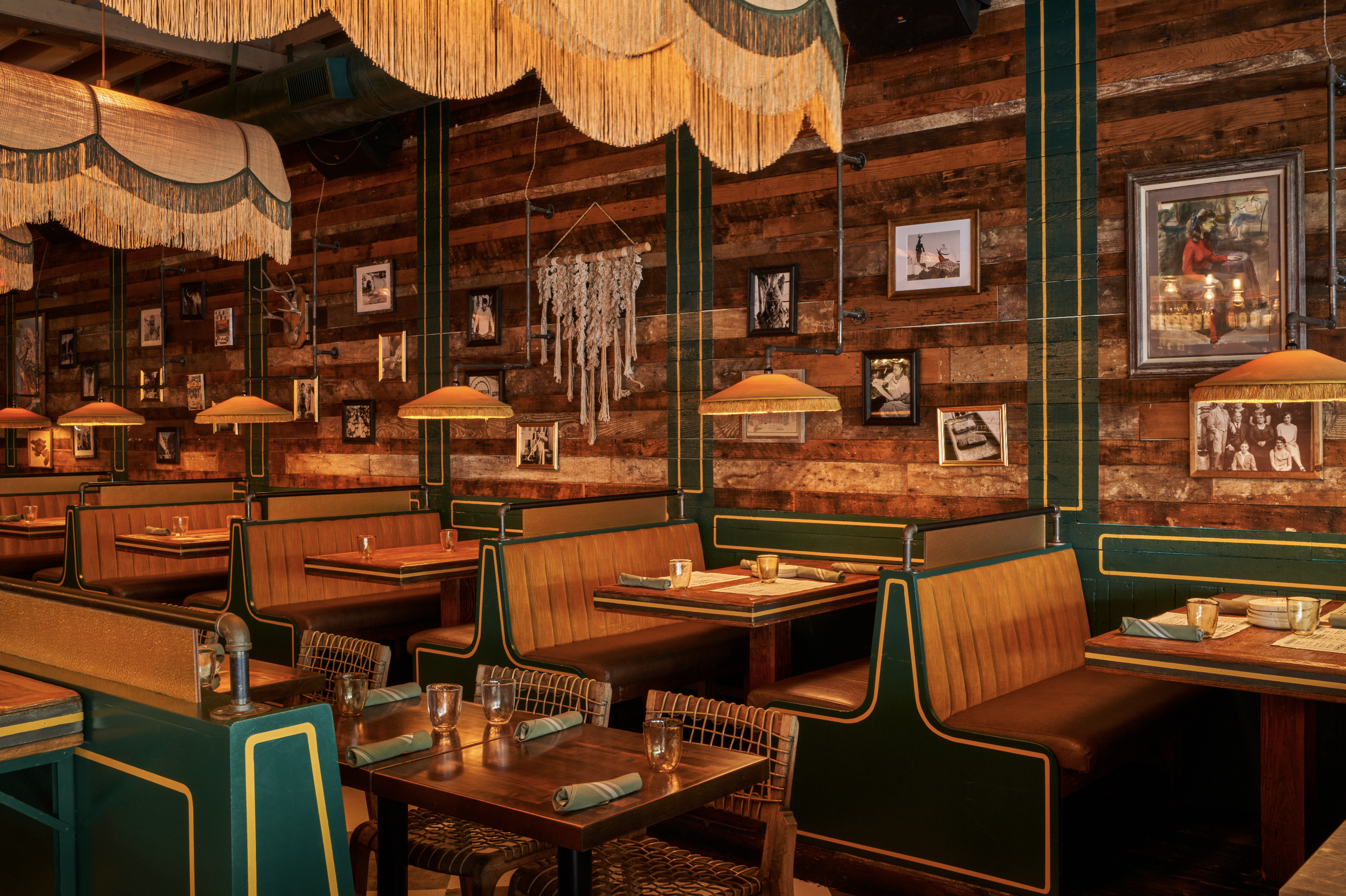 Daisy Margarita Bar delivers an elevated Mexican cantina experience to LA's Sherman Oaks neighborhood. To transform the 100-seat space on the busy Ventura Boulevard thoroughfare, Proprietor Matt Egan tapped Alexa Nafisi-Movaghar of Adean Studios who also designed Egan's Los Feliz restaurant, Mírate. With the traditional vaquero as a beacon of inspiration, Adean utilized mixed textures and layered colors to create a rustic Mexican tavern experience that's equally glamorous and lowbrow. Oil painted portraits, taxidermy, neon signage and other vintage finds, each hand-selected by Egan and sourced predominantly from Mexico, fill the dimly lit space. A custom-built jukebox serves as a focal point, accented by fringe, leather and interior wood paneling characteristic of a dive bar setting. In its design approach Adean upcycled elements from the former tenant including the existing wood, tables and booths––retrofitted to align with the space's new vision. Adean applied a bold color palette of vibrant greens and yellows, balanced by the building's previous hacienda detailing and terra cotta accents.
